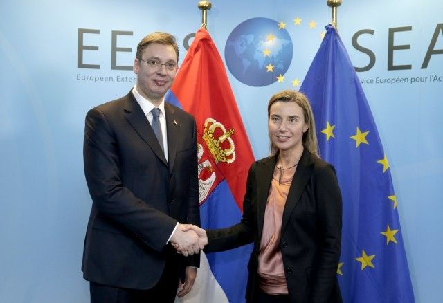 Përkundër kësaj, në takimin të cilin e ka zhvilluar kryeministri serb, Aleksandër Vuçiq, po në të njëjtën ditë, me Mogerinin, në sfond, përveç flamurit të BE-së, duket edhe flamuri i Serbisë. /Telegrafi/